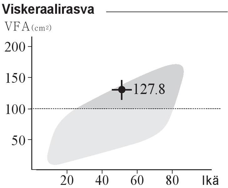 InBody 770 antaa viskeraalirasvalle arvon ja se ilmaistaan neliösenttimetreinä (cm²) vatsaontelon poikkileikkauskuvasta navan korkeudelta. Viskeraalirasvan määrä kasvaa luonnollisesti iän myötä, mutta suositeltava arvo iästä riippumatta on alle 100 cm².